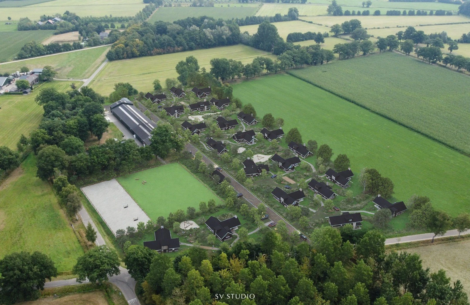 Luchtfoto van het toekomstige Havezate Hall, midden in het groen